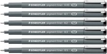 Fineliner with metal-framed tip for writing and sketching. Pigment ink, water based, permanent, light fast and waterproof once dry. Erasable on tracing paper. ISO color coding. . cap with metal clip.